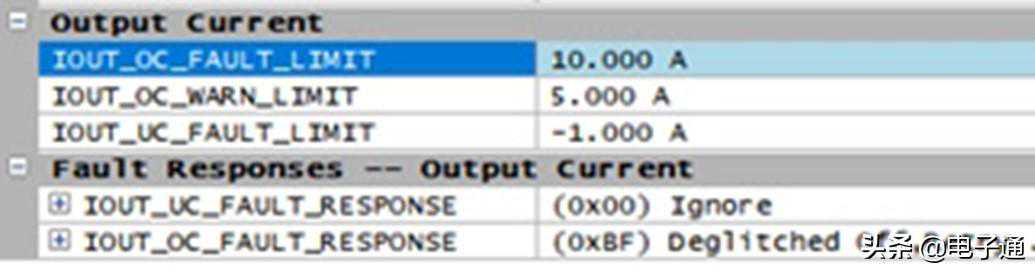 必须根据我们选择的硬件来设置配置命令。在本示例中,IOUT_CAL_GAIN应设置为400(0.4V/A)。单位为毫欧。如果没有可能会影响READ_IOUT值的温度系数或热时间常数,则其他与电流相关的命令可能具有默认值。MFR_IOUT_CAL_GAIN_TC、MFR_IOUT_CAL_GAIN_TAU_INV和MFR_IOUT_CAL_GAIN_THETA的默认值设置为零。
