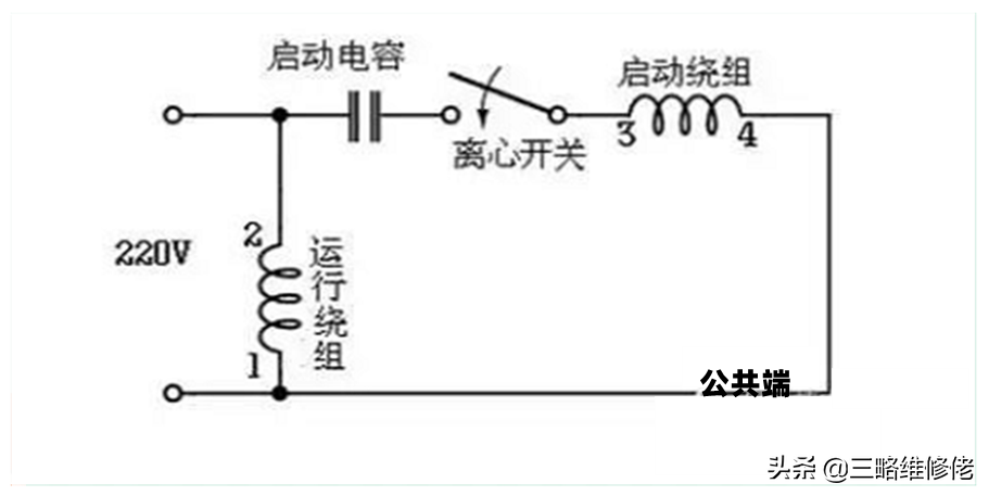 第三种,带离心开关和启动电容的单相电机。这电机静止时离心开关是接通的,加电后起动电容参与起动工作,当转子转速达到额定值的70%至80%时,离心开关便会自动弹开,将电容断开,这时启动电容完成任务,启动绕组不参与运行工作,而电动机以运行绕组线圈继续动作,如图所示。
