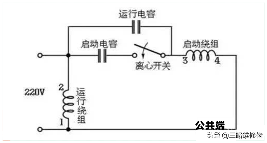 2:电机内部有离心开关即带启动电容又带运行电容电机有四个线头,也就是在带离心开关只有启动电容电机的基础上,多了一个运行电容的线头,这时只需将运行电容的一脚接运行绕组2端引出的线头接口,运行电容的另一脚接启动绕组3端引出的线头接口即可,如图: