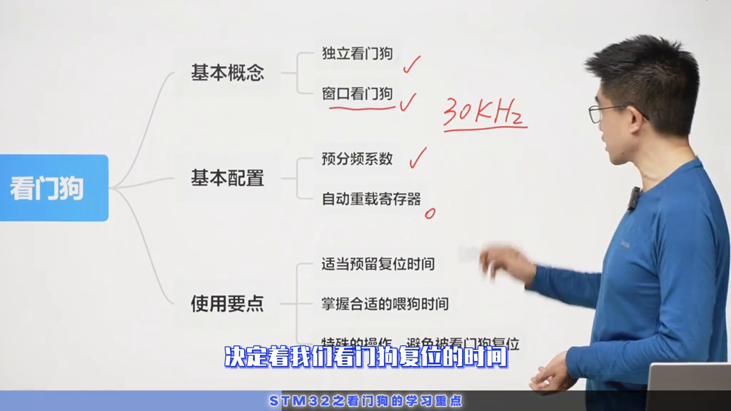 ·一个它可以设置一定的预分频系数,因为内部的时钟源是30K,一个低频振荡器,当它在分频以后可以适当的延长看门狗复位的周期。