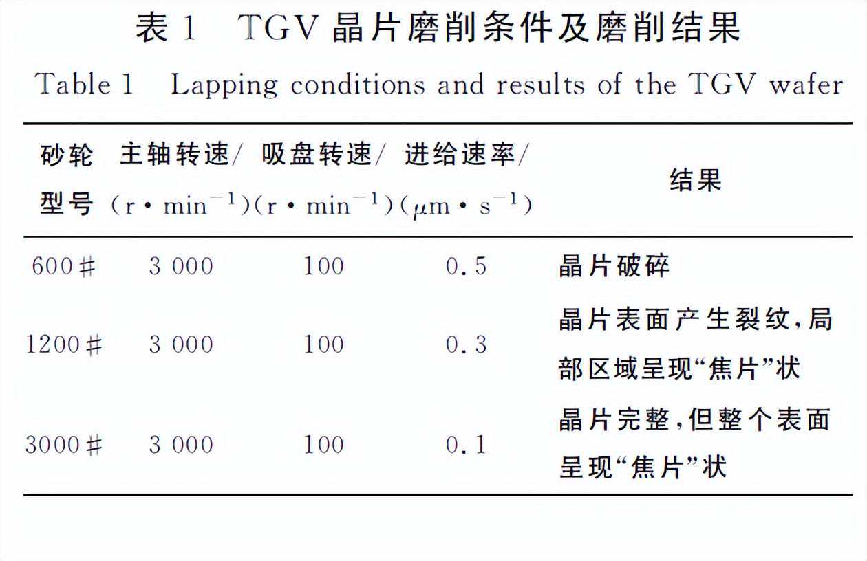 表1为磨削条件及相关磨削结果。采用如表1所示条件对TGV晶片进行磨削。由表1可知,采用不同条件进行磨削时,TGV晶片表面均未露出预期的腔体图形。这可能与两种材料的硬度不同有关,玻璃的努氏硬度为418kg/mm2,而硅的努氏硬度为850kg/mm2,磨削用金刚石砂轮的努氏硬度为7000~8000kg/mm2。采用粒径较大的砂轮(型号为600#)进行磨削时,由于撞击力较大而使晶片破碎;采用粒径稍小的砂轮(型号为1200#和3000#)进行磨削时,砂轮的磨粒与晶片间的贴合较紧密,粒径的减小使磨削力减小,砂轮高速旋转磨削产生的热量不能被及时排出致使温度迅速升高,玻璃在高温下变软、变黏,将砂轮“糊住”,砂轮的磨削性能进一步降低,如此恶性循环导致晶片表面出现不同程度的“焦片”现象,故磨削不适合TGV晶片的机械加工。