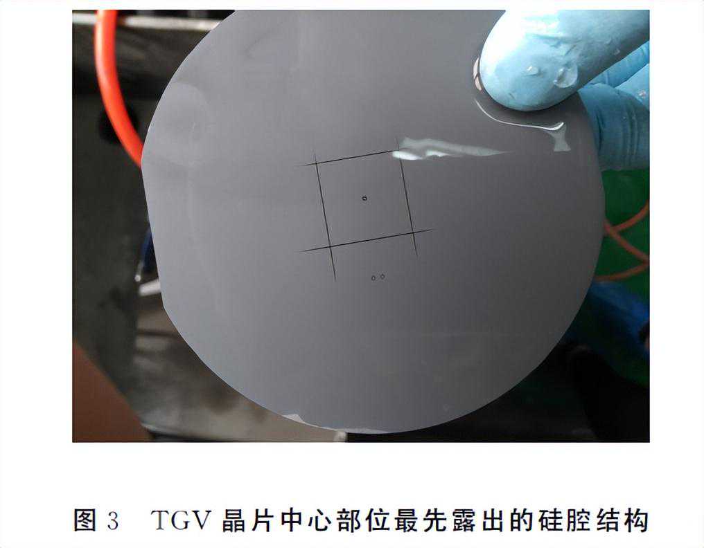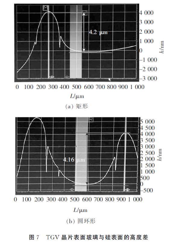 为便于后续加工及测试,使用标准SC1#液对研磨后的TGV晶片进行清洗,时间约10s。采用平面度测量仪测试TGV晶片的几何参数,结果如图5所示,TGV晶片的翘曲度与总厚度变化(TTV)值分别为7.149μm与3.706μm,表明经过研磨的TGV晶片正、背表面虽都存在填充有玻璃的硅腔结构,但晶片表面较为平坦,玻璃与硅没有明显的高度差,故此种研磨工艺适合TGV晶片的加工。