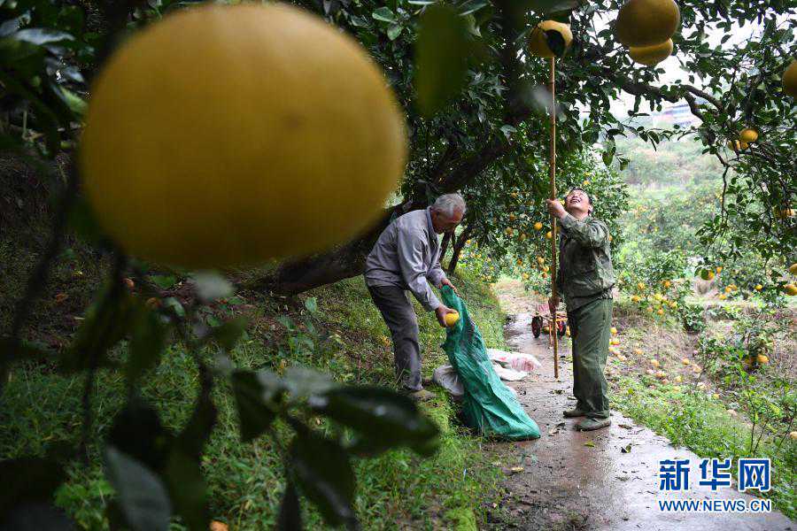 在梁平合兴街道龙滩村,农户在柚园内采摘柚子(11月18日摄)。新华社记者唐奕摄