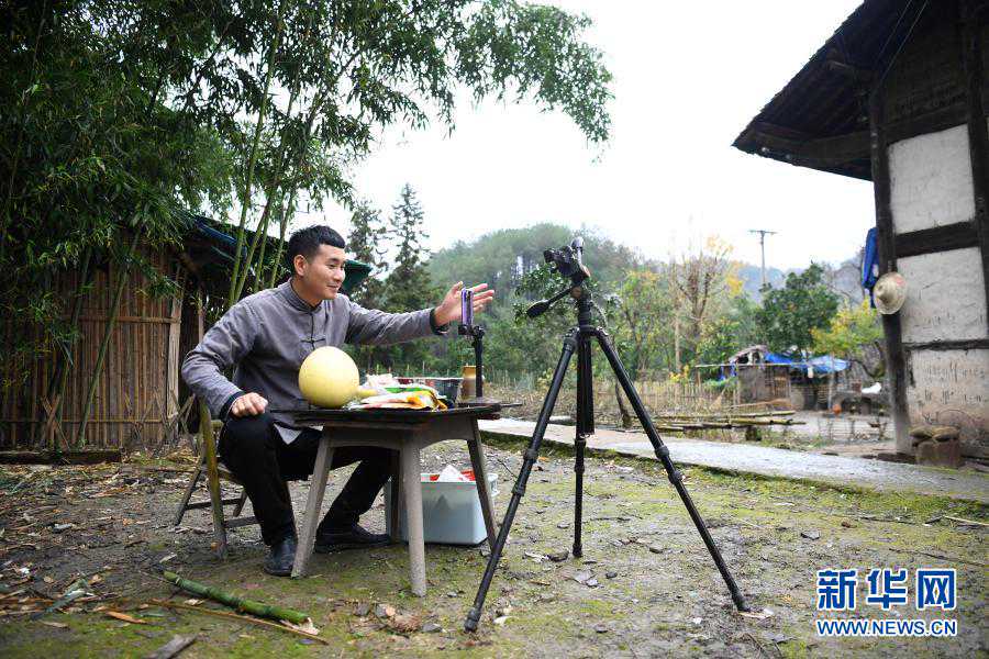 梁平七星镇小伙曾庆贵通过网络直播推销家乡特色农产品(11月18日摄)。新华社记者唐奕摄