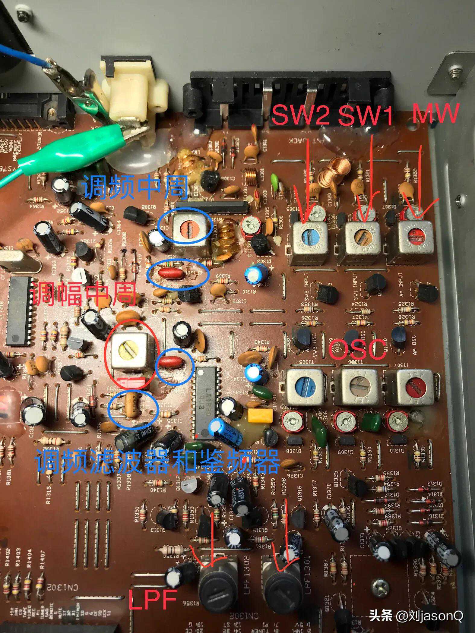 这台机维修除了常规的更换瓷管电容之外,还有几个值得留意的地方:接入天线反而静噪了,问题往往指向鉴频器异常从而触发了静噪电路启动。调频中频滤波器和鉴频器通常要筛选配对同时更换,否则有频偏问题,如果实在没有条件配对,可以用小电容略微修正鉴频器的移相频率。短波和中波所需的环天线大小不同阻抗不同,不可混用否则不收台或者灵敏度低。