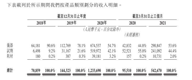 从产品上看,博日科技主要拥有仪器、试剂两大业务。2018年-2020年和2021年1-3月,仪器产生的销售收入分别为6418.1万元、11276.9万元、67453.7万元、29084.7万元,试剂产生的销售收入分别为649.8万元、3116.7万元、51997.2万元、24109.2万元,两者合计占当期主营业务的99.8%、99.7%、96.8%、98%。