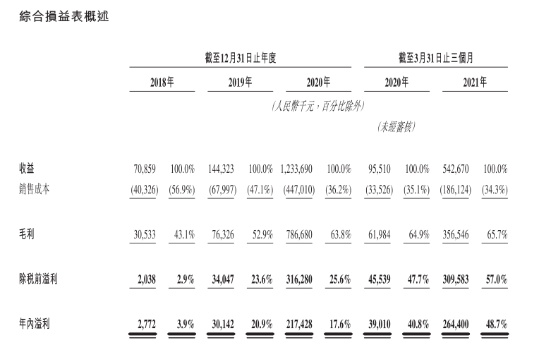 同期,公司毛利也实现跨越式增长,在2018年至2020年的毛利分别为3053万元、7632.6万元、7.87亿元,年复合增长率407.7%,净利润分别为277.2万元、3014.2万元、2.17亿元。