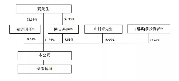 PCR先驱市场占有率进一步扩大招股书显示,博日科技在上市前的股东架构中,控股股东为贺贤汉先生,其拥有全部已发行股份约58.58%的权益,包括拥有约41.35%的直接权益、分别透过先导因子及博日基链拥有约8.61%及8.61%的间接权益;员工持股平台先导因子、博日基链,分别持股8.61%、8.61%;山村章先生,持股18.95%;16名投资者,合计持股22.47%。