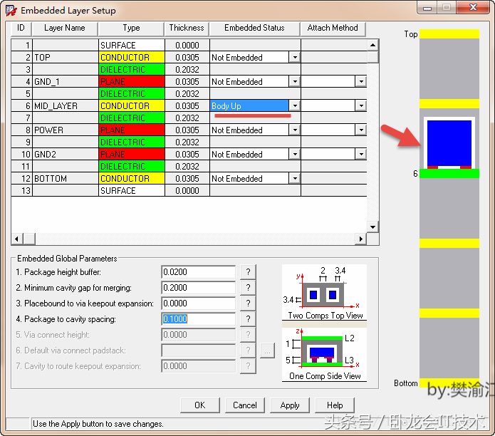 EmbeddedGlobalParameters全局埋入式器件的叠层设置参数,其意义在右边的坐标中有对应显示,包括:Packageheightbuffer:定义埋入式器件腔体与相邻叠层的距离限制;