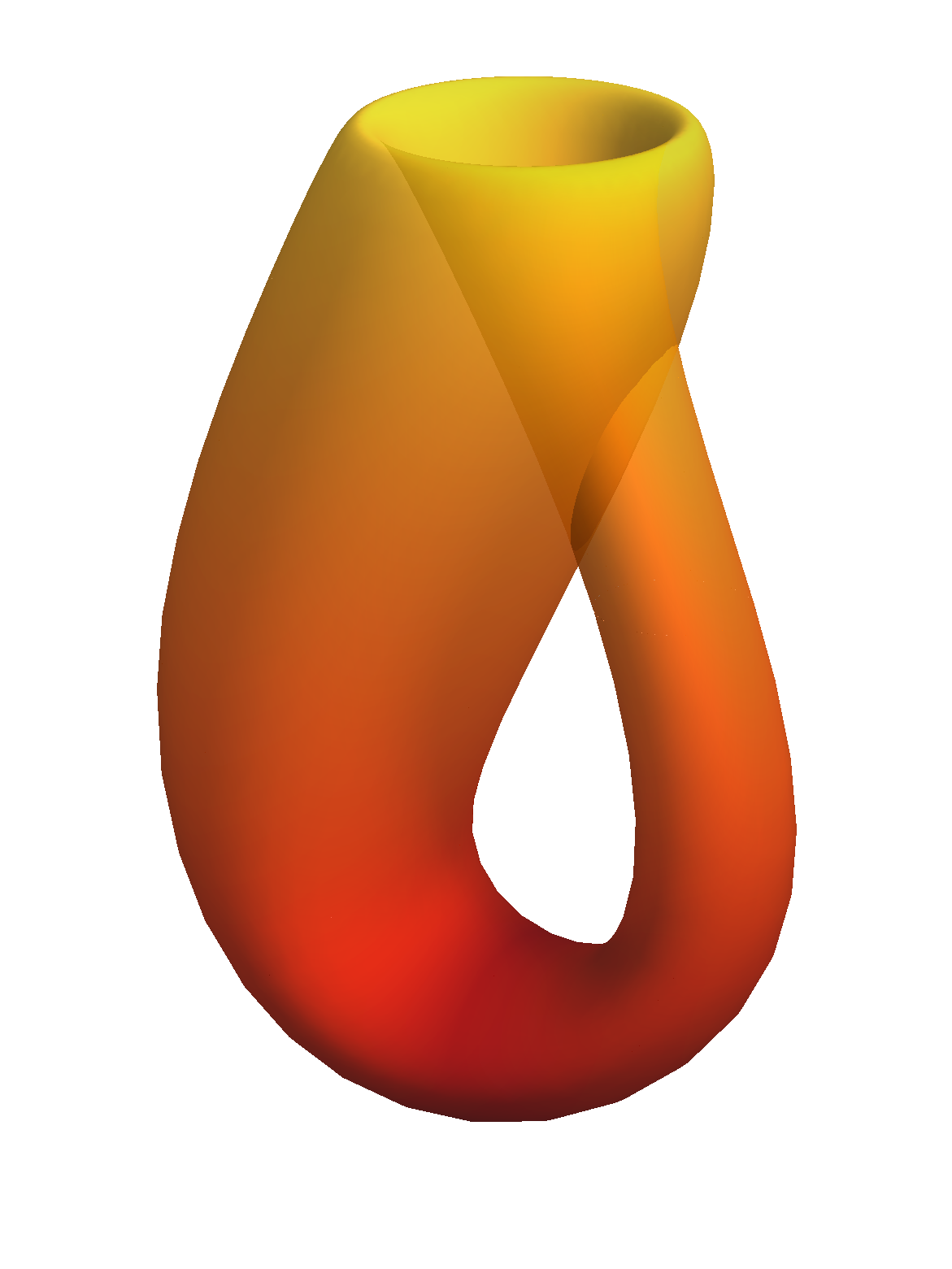 似乎看起来并不复杂,就是一个瓶子的瓶口扭曲过来和瓶底相连接,并且把瓶底打开变成入口,口一直向内就能走到“内部”,从“内部”一直走就可以走到外部,但事实上真正的克莱因瓶却应该在四维!