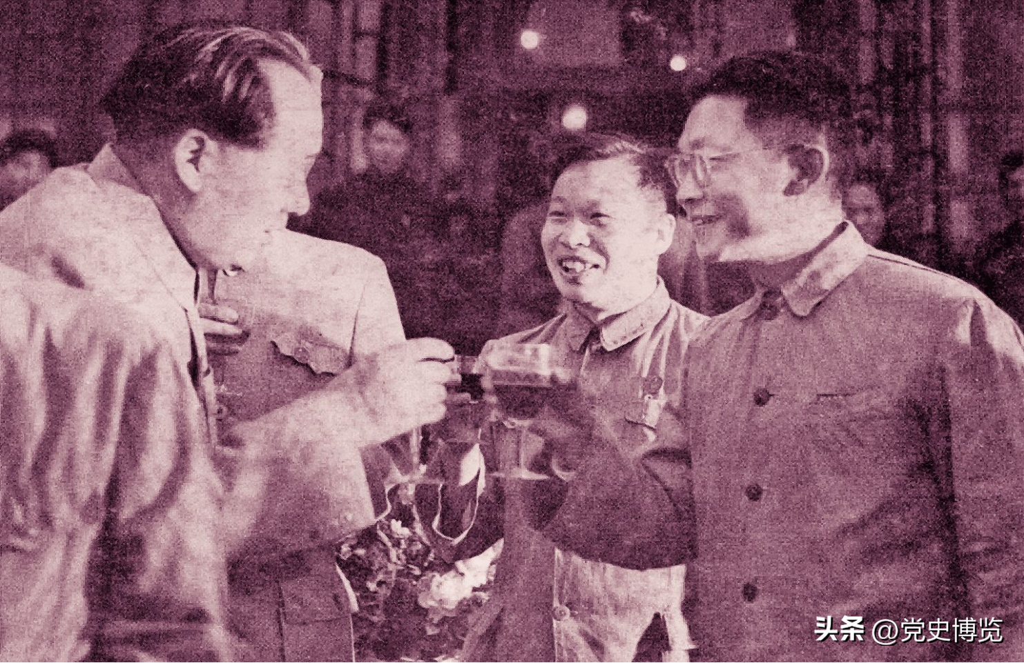 1951年,毛泽东与钱三强(右二)在全国政协庆祝“七一”酒会上