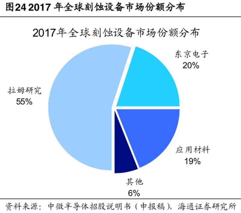 而根据SEMI大半导体产业网援引SEMI数据,预计2018年晶圆处理设备市场空间为502亿美元。因此,海通证券预计2018年全球刻蚀设备销售额在100亿美元左右。
