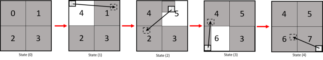 如图所示,当左边CTU完成编码时,区域0,1,2,3的重建像素将存储在IBC的内存中(状态0)。当前CTU按照4-5-6-7的顺序依次编码四个区域。IBC内存中可用于对当前块进行预测的参考像素如状态1~状态4所示,在此过程中逐步将左边CTU中的像素,更新为当前CTU中的重建像素,直到当前CTU所有区域完成编码。