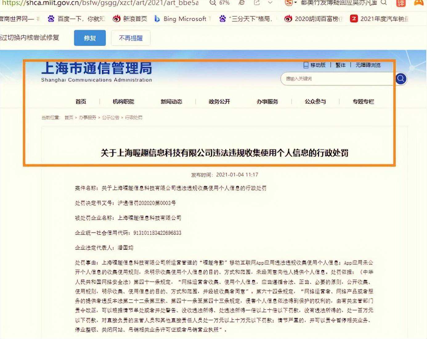另外,上海喔趣信息科技有限公司曾因违法违规收集使用个人信息被上海通信管理局处罚,