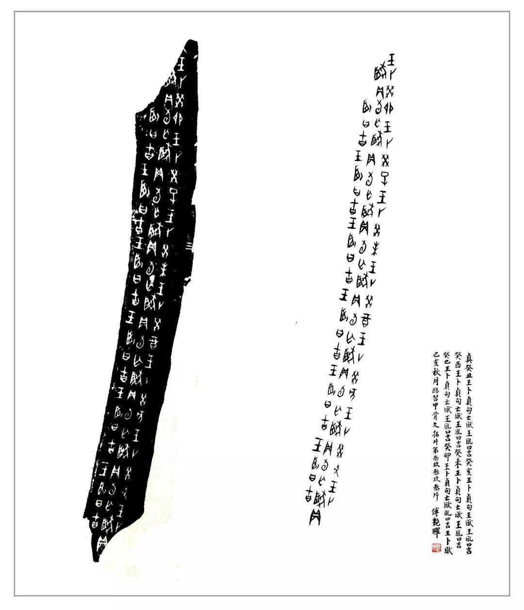付艳晖:学习书法要重视临帖,学习甲骨文书法也是一样。《探赜》中拓片H39393辨识度很高,集中体现了黄组卜辞的特征。