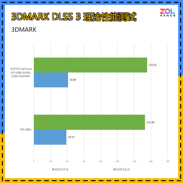 另外我们使用3DMARK刚刚更新的DLSS3进行了相关性能测试。TUFRTX4080SUPEROC相比RTX4080的提升为:开启下提升2%,关闭下提升4.6%。