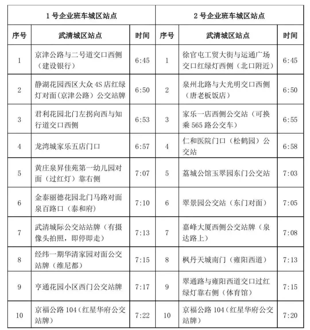 2号车,武清城区首发站徐官屯工贸大街与运通广场交口红绿灯西侧(北口对面),发车时间早上6:45;科技谷管委会首发站,发车时间下午17:30。