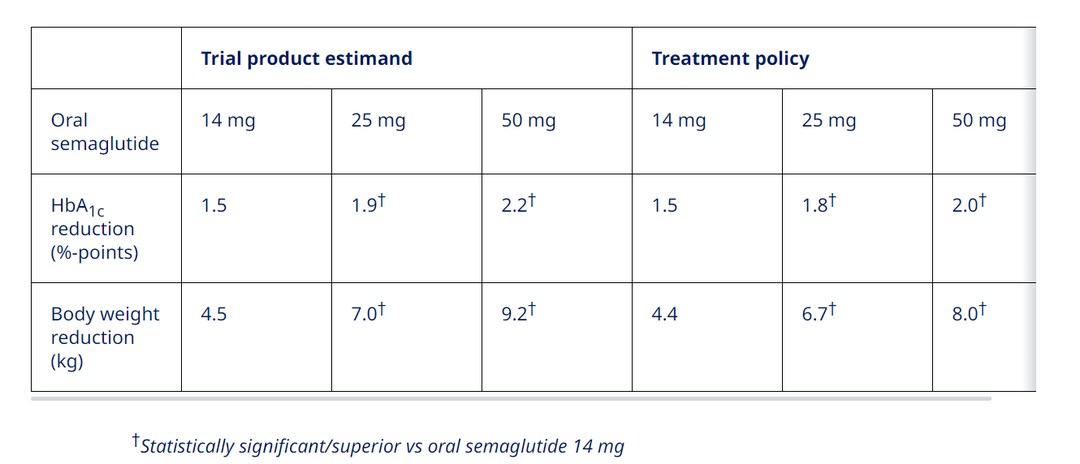 结果显示,口服25mg和50mg剂量的司美格鲁肽在不论降低糖化血红蛋白(HbA1c)还是减重方面的效果都优于口服14mg剂量的情况。