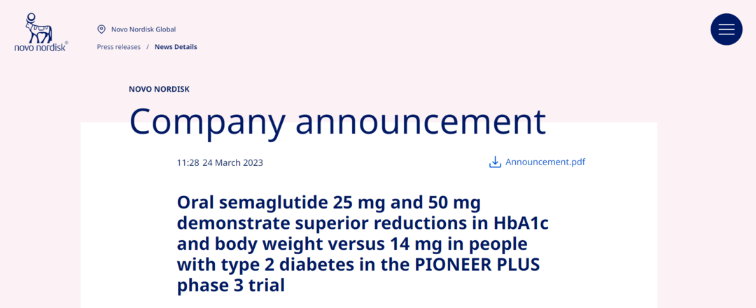 3月24日,生物制药公司诺和诺德(novonordisk)发布了新型口服版司美格鲁肽(Semaglutide)治疗2型糖尿病成人患者的Ⅲb期PIONEERPLUS研究结果,表示更大剂量的口服司美格鲁肽药物不论对降低糖化血红蛋白(HbA1c)还是减重的效果都更好,并展现出良好的安全性和耐受性。