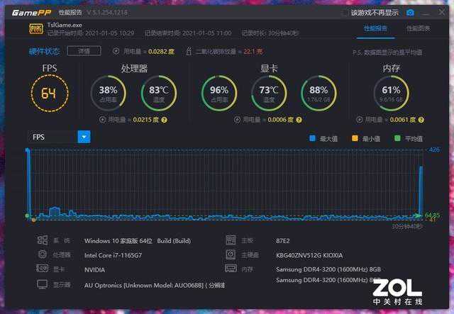 我们直接来看帧数表现,在《PUBG》中,画质整体调整为低,在海岛地图中进行一局第三人称四排对局,死后观看,直到比赛结束,整局游戏平均帧数64帧。