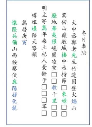 那“奉陪郭老先生”的是哪位官员呢?落款只显示“懷隆兵備山西按察使鹿□□□□”;按“鹿”为姓氏,未查到相关官员,按“鹿”为地方,未查到相关地名,试从“山西按察使”入手,发现吕坤于明万历十七年至万历二十年,历任山西按察使、巡抚、陕西省右布政使、山西巡抚。但吕坤为归德府宁陵人,籍贯与“鹿”字无关,且后面模糊的笔画字形无论如何也不像“吕”字……这一推测显然不能成立。一时间解读出现了困难,直到查询康熙年的《怀来县志》才发现这样一条记载:“孙化龙,号鹿阳,直隶获鹿人,隆庆戊辰进士,万历十八年任按察使。”这时,隐约的笔画和字形才变得清晰起来,落款之人应该就是这位素有“善诗文”之名的孙化龙,时(万历十八年)正新任山西按察使,由于此碑记录时间为冬天,也可解释其与吕坤的前后任职关系。