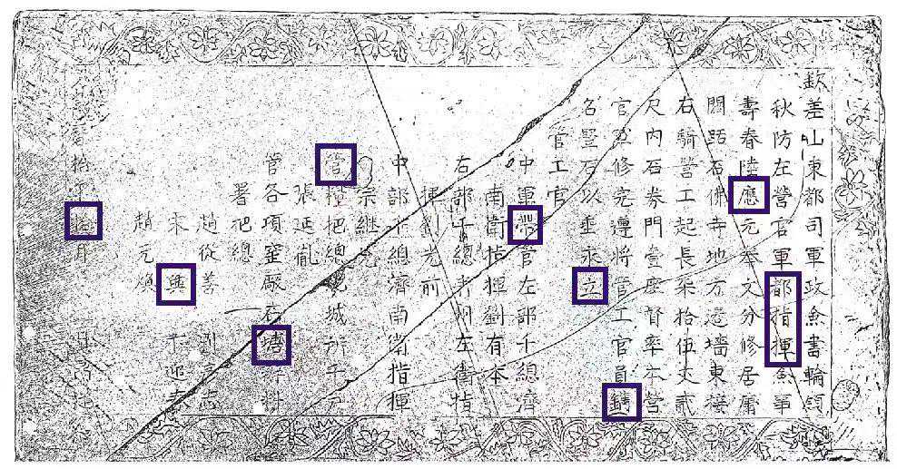 尽管如此,本次课题的成果还是颇为丰富,以官员为例,54块碑刻中可辨认的官员170人,所记载的官职包括了110多种,这些官员从尚书、督抚到百户、哨总等,基本涵盖了明代边军体系各级官职,但由于明代职官体系复杂,划分繁琐,既有实职,亦有兼职,还有署职,导致品级及称谓多有变化,还有待开展更为深入的研究。