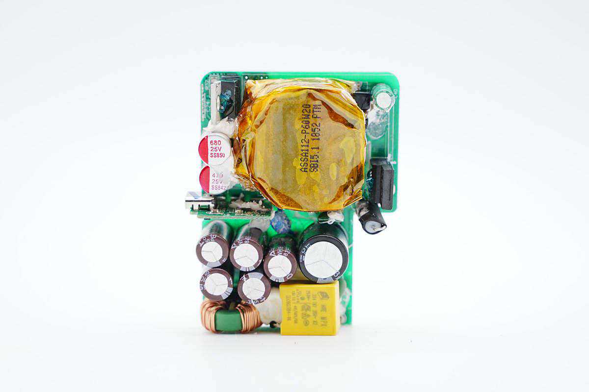 充电器PCBA模块正面一览,在上方为变压器,变压器左侧为同步整流管和输出滤波电容,下方焊接USB-C接口小板。右侧为初级开关管,下方为高压滤波电容和输入EMI滤波电路。