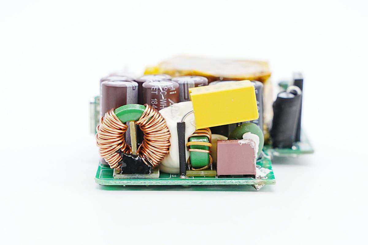 PCBA模块背面焊接整流桥,初级主控芯片和同步整流控制器。在交流输入和直流输出侧之间的PCB镂空加强绝缘。