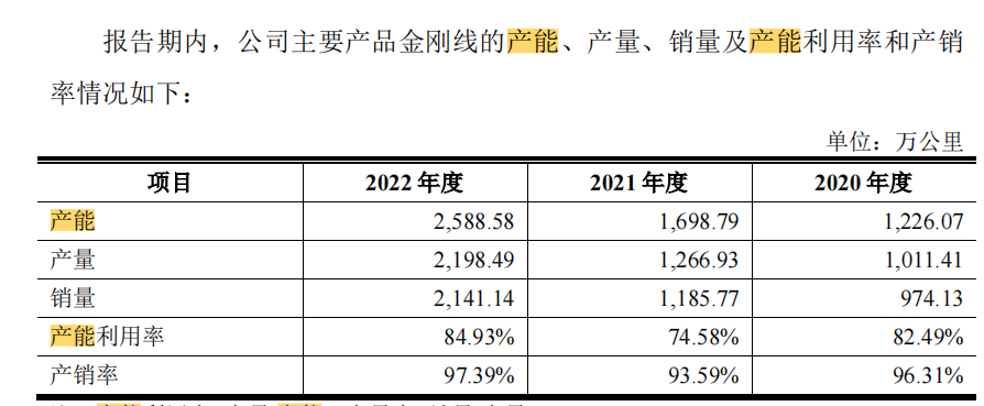 然而,2022年其产能为2588万公里,产品销量为2141.14万公里,产能利用率不到85%。与2022年产能相比,9000万公里的产能扩张了近2.5倍。