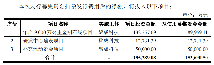 在硅料企业停产、硅片价格下降的趋势下,聚成科技还要大扩产。根据此前的招股书披露,聚成科技拟募资15.23亿元,其中近9亿元用于年产9000万公里金刚石线项目。