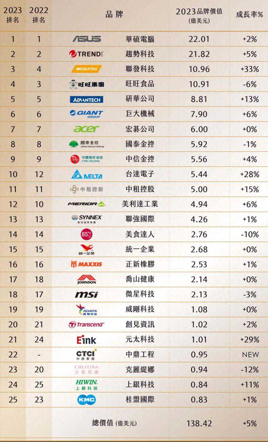 2023台湾地区最佳国际品牌价值榜单公布,华硕蝉联榜首,联发科为今年增长最快的品牌。研华、台达电、元太科技等皆有双位数增幅。品牌前25名总体价值达138.42亿美元,其中前10大品牌价值自2012年后再达百亿美元。