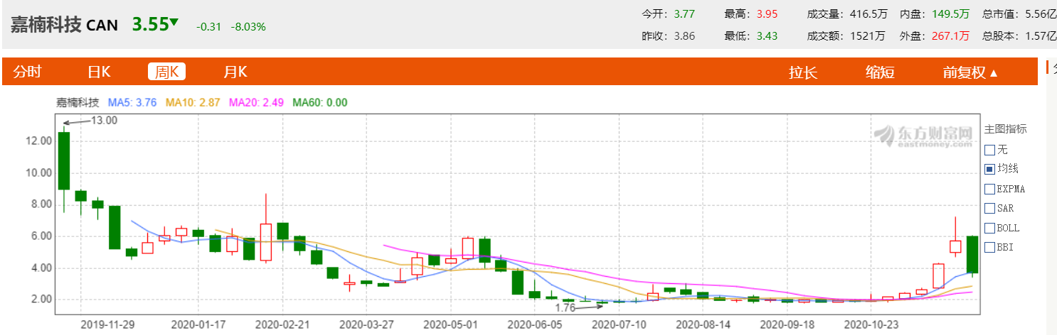 据了解,嘉楠科技发行价为9美元,上市后首个交易日即跌破发行价,收盘价为8.99美元。随后,嘉楠科技的股价呈现波动下滑态势,今年7月2日,其股价创下1.76美元的历史低点。如今嘉楠科技股价虽有回升,但较历史13.00美元的高点已下滑72.69%。截至发稿前,嘉楠科技股价报3.55美元,总市值5.56亿元。