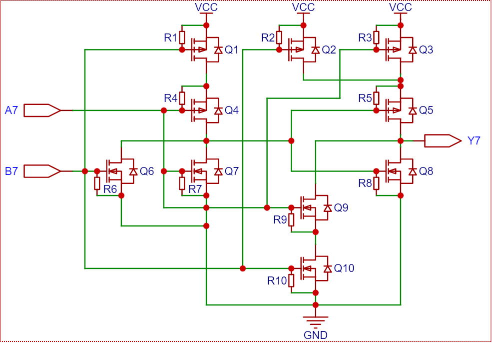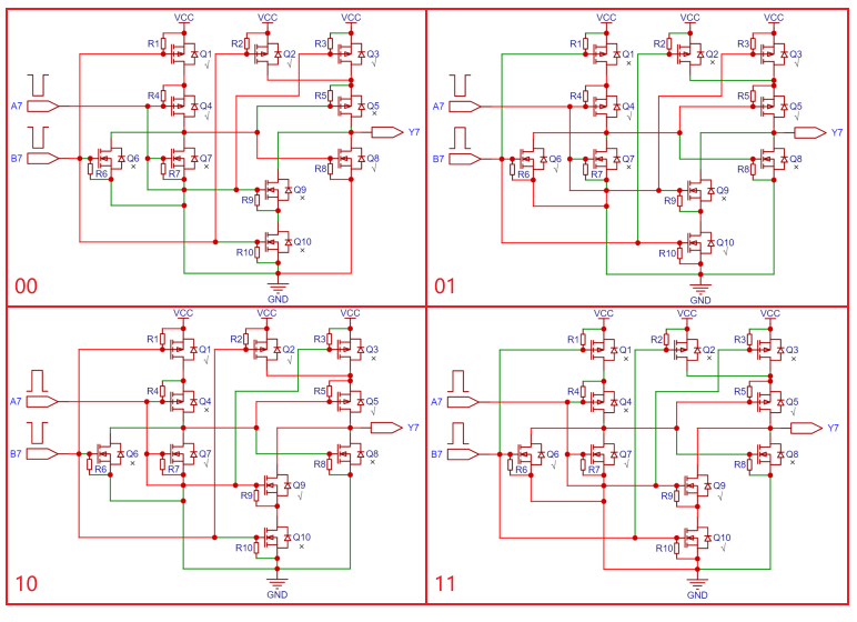 ①当A7输入低电平,B7输入低电平时,Q1,Q2,Q3,Q4,Q8导通,Q5,Q6,Q7,Q9,Q10截止,Y7输出低电平;