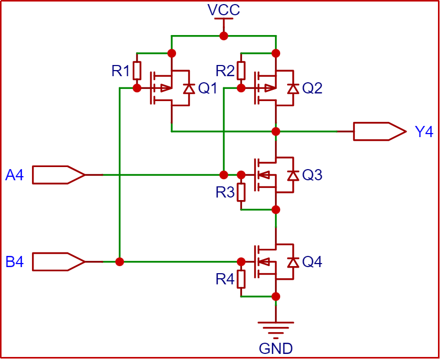 ③当A4输入高电平,B4输入低电平时,Q1,Q3导通,Q2,Q4截止,Y4输出高电平;