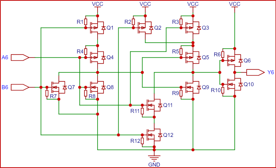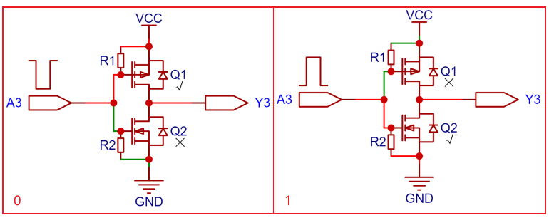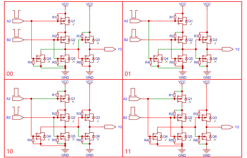 ③当A2输入高电平,B2输入低电平时,Q2,Q3,Q4导通,Q1,Q5,Q6截止,Y2输出高电平;
