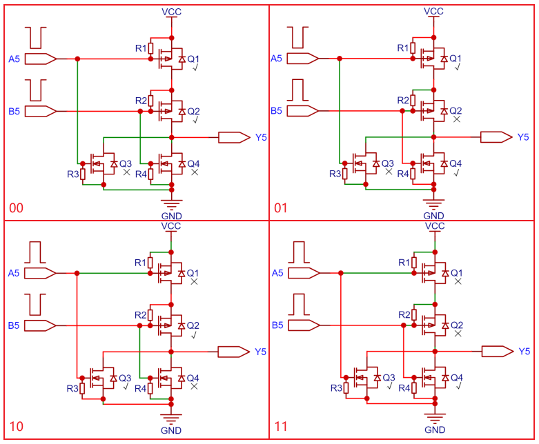 ④当A1输入高电平,B1输入高电平时,Q3,Q4,Q6导通,Q1,Q2,Q5截止,Y1输出高电平;