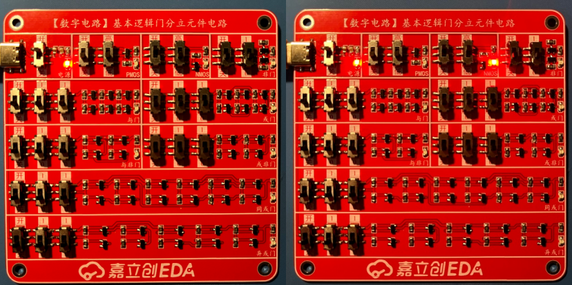 注意焊接时PMOS和NMOS不要焊错,各逻辑门电路中,上方朝左的为PMOS,下方朝右的是NMOS;LED上面的电阻为1K,其余的均为10K;电容为滤波作用,可以不焊接。