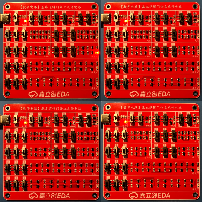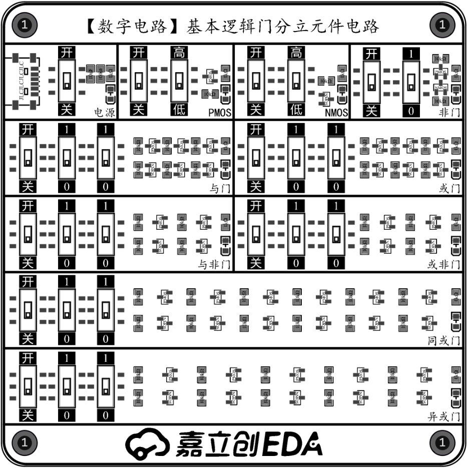 一、项目简介「逻辑门」是数字电路上的基本单元,能够实现各种逻辑关系。「基本逻辑门分立元件电路」采用MOS管搭建而成,实现验证:与、或、非、与非、或非、同或、异或等逻辑运算。