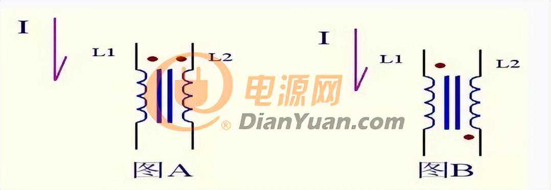 图三,一眼便看出就是点不同。当图A里L1有电流I流入时自身产生上+下-感应电动势。同时在图AL2里也产生一个上+下-的电动势。当然这两个电感线圈必须在同一个磁芯(同一个磁路)上才可以的。在图B里的L2就产生一个方向相反的感应电动势。(在图中我们定义为L1是初级线圈,L2是次级线圈)。