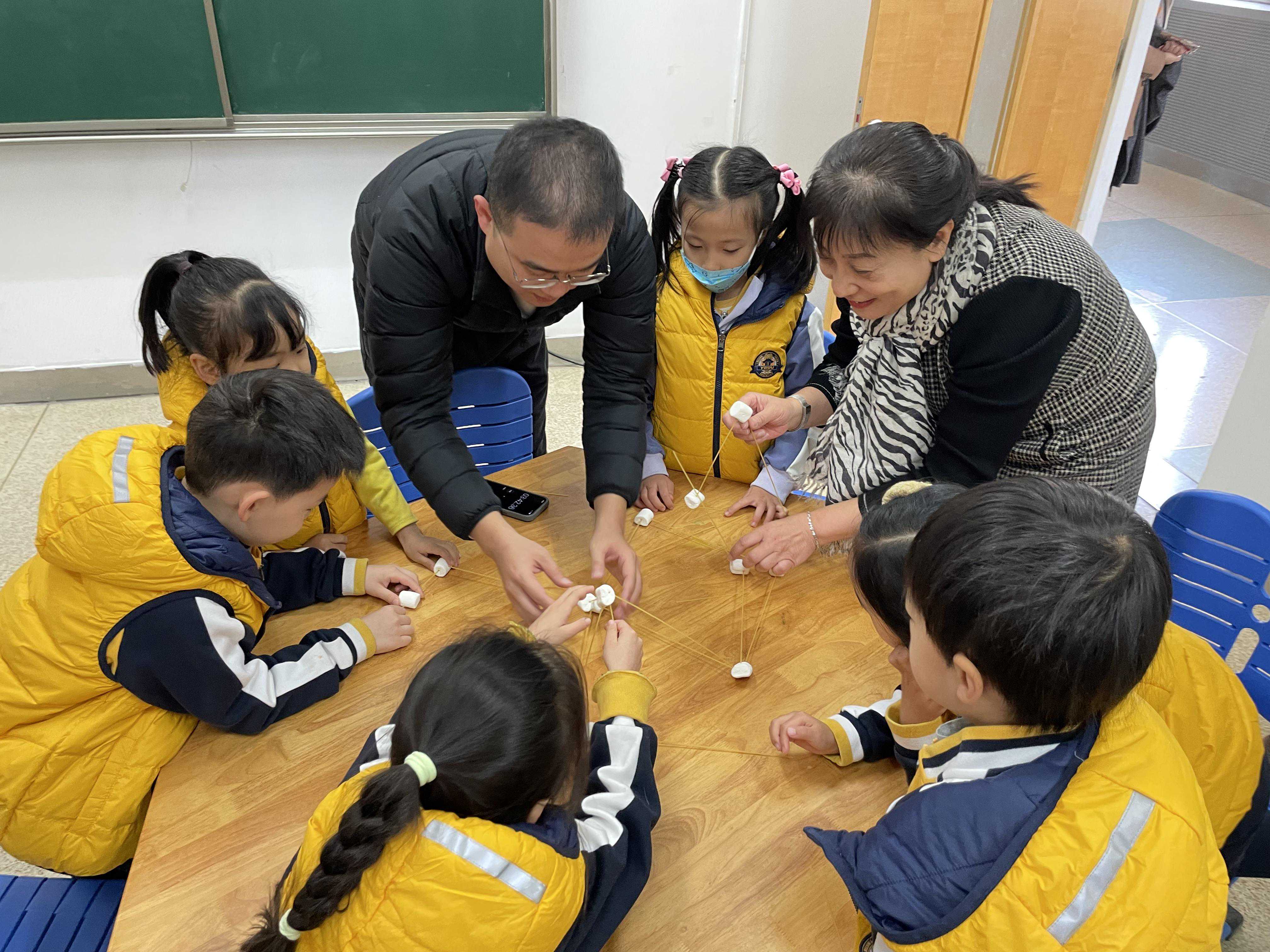 另一间活动室内,棉花糖意面塔游戏正在快乐的气氛中进行。比赛分小组进行,每个小组领到了15根意面和20块棉花糖,7分钟内进行讨论并搭建,最后比一比哪个小组的塔高。“咱们试试三角形怎么样?看这样是不是相当于有了一个小金字塔……”怡海小学副校长杨捷在旁边引导,孩子们在棉花糖的香甜中开动脑筋。