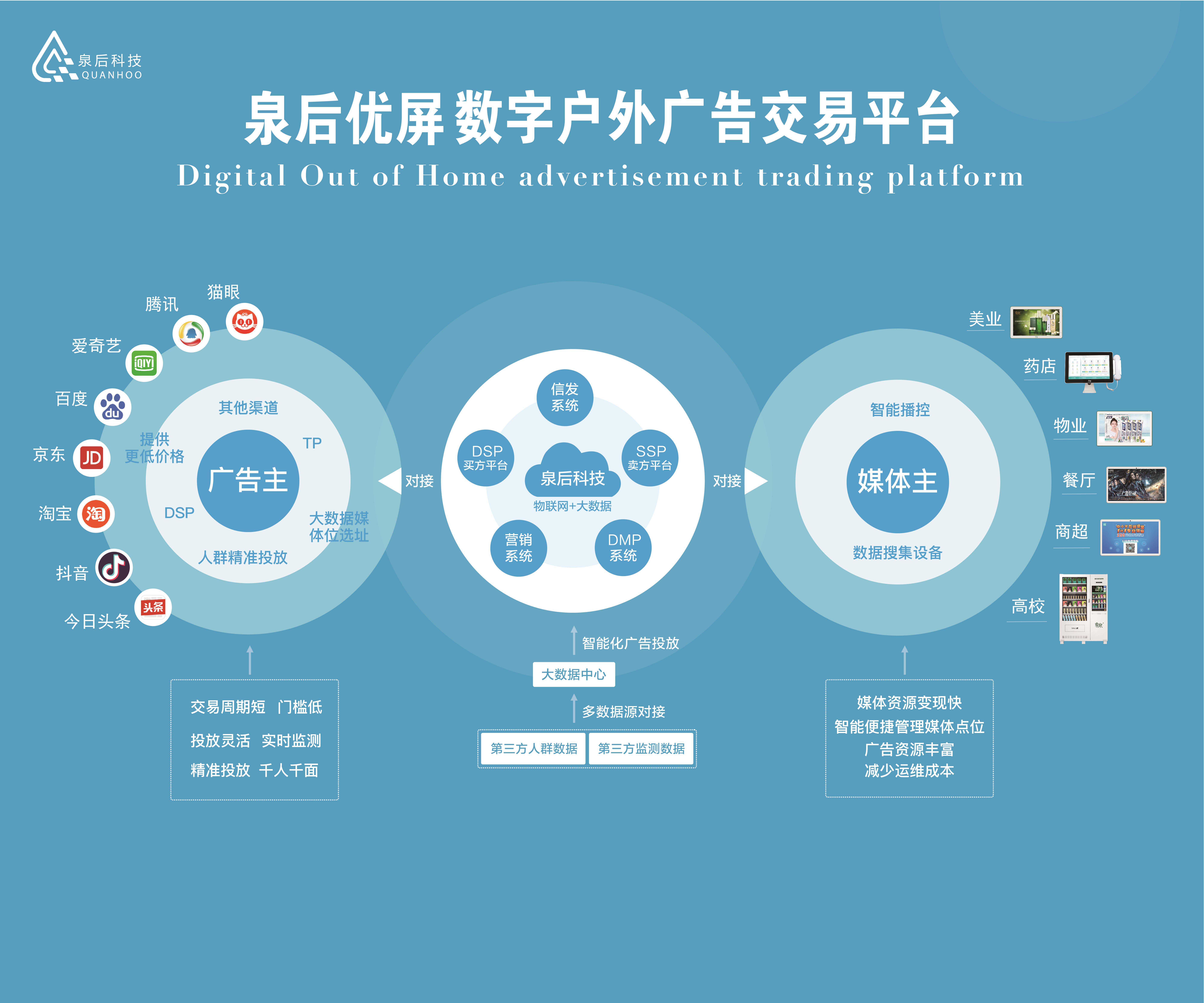 泉后优屏数字户外广告交易平台,为广告主和媒体主提供线下程序化广告交易服务、广告软硬件解决方案以及大数据解决方案。平台作为中间方,可实现数字户外广告卖方(媒体主)和数字户外广告买方(广告主)的连接打通,依托成熟的DSP、DMP及SSP产品体系和优质的算法模型,全面提升数字户外广告直采的效率和广告投放的精准度。