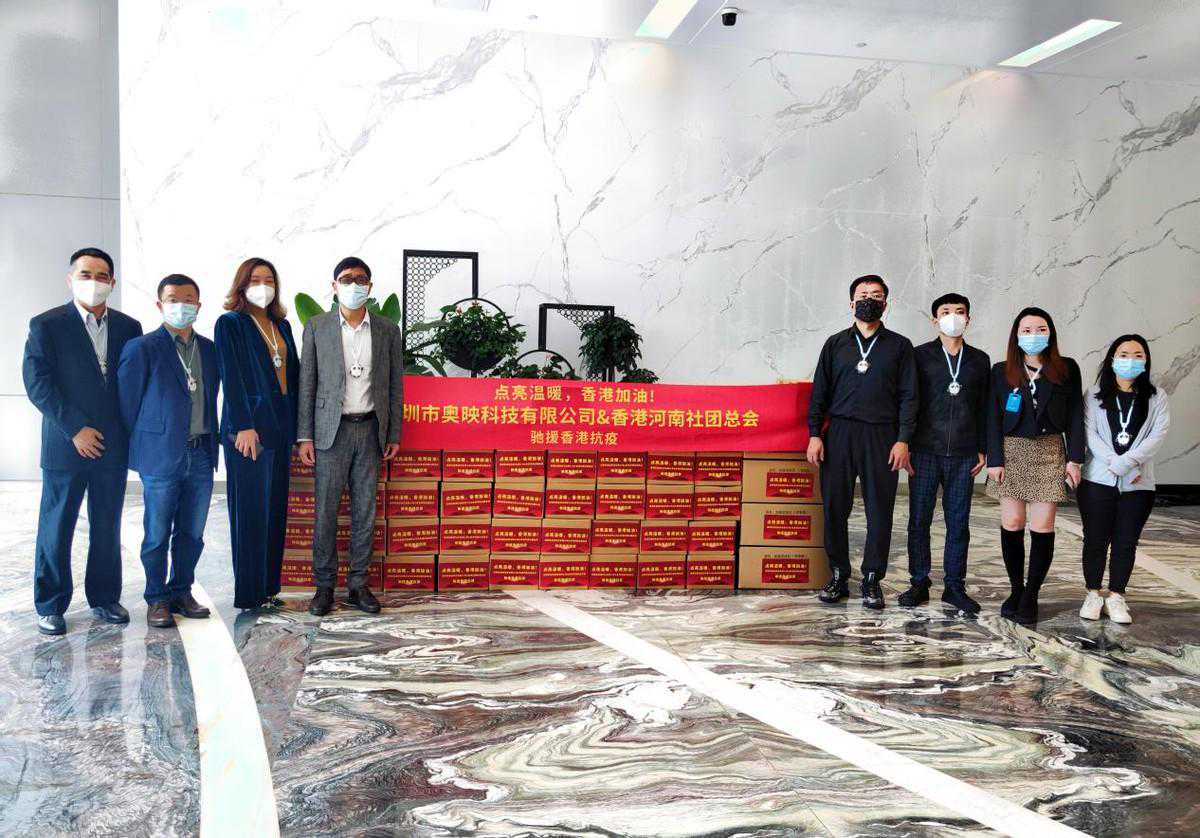 3月11日,香港河南社团总会获得深圳奥映科技有限公司捐赠一批价值100多万元的抗疫救援物资,包括公共环境消杀二氧化氯消毒液、免洗手消毒液、冬奥会吉祥物“冰墩墩挂坠”及“雪容融挂坠”,用于关爱前线义工和新闻逆行者。