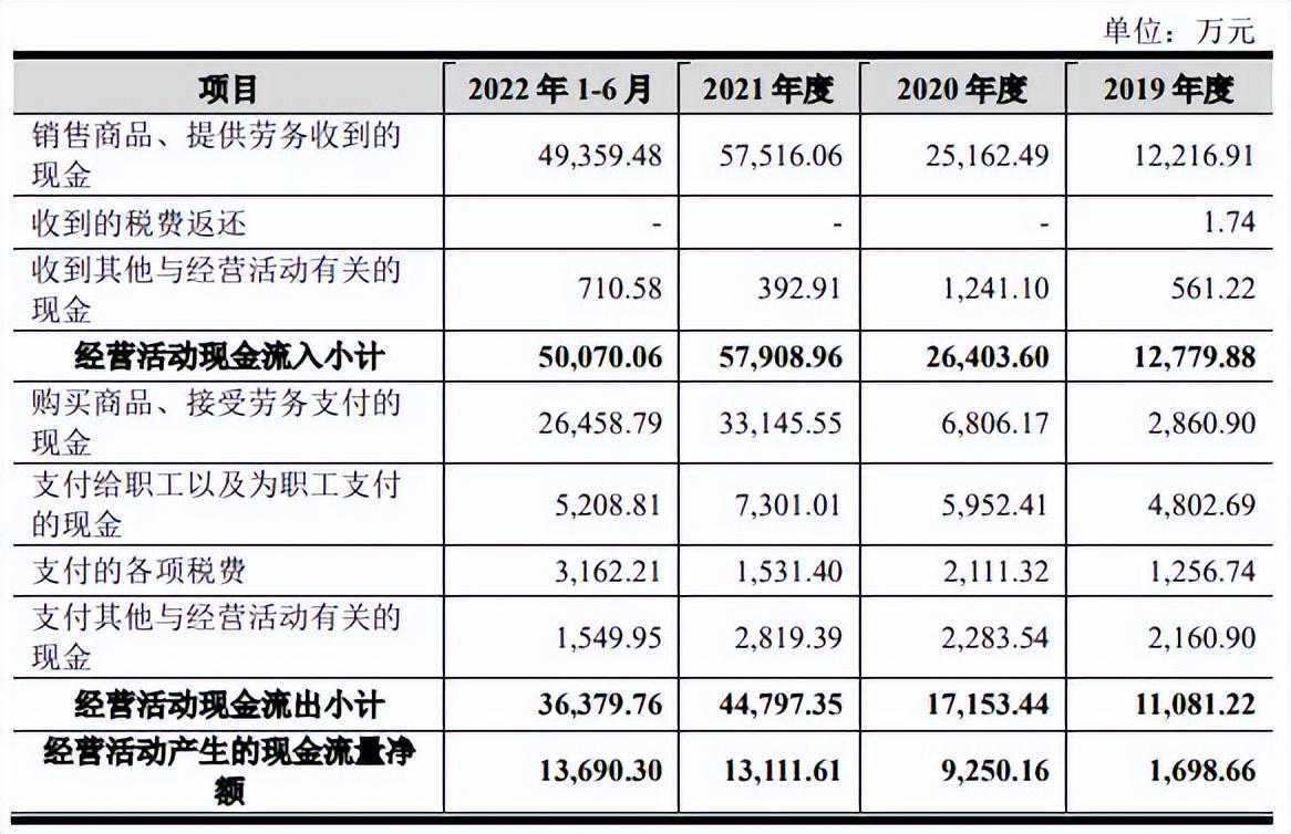 2019年、2020年、2021年、2022年1-6月,惠通科技的销售商品、提供劳务收到的现金分别为12,216.91万元、25,162.49万元、57,516.06万元、49,359.48万元;经营活动产生的现金流量净额分别为1,698.66万元、9,250.16万元、13,111.61万元、13,690.30万元。