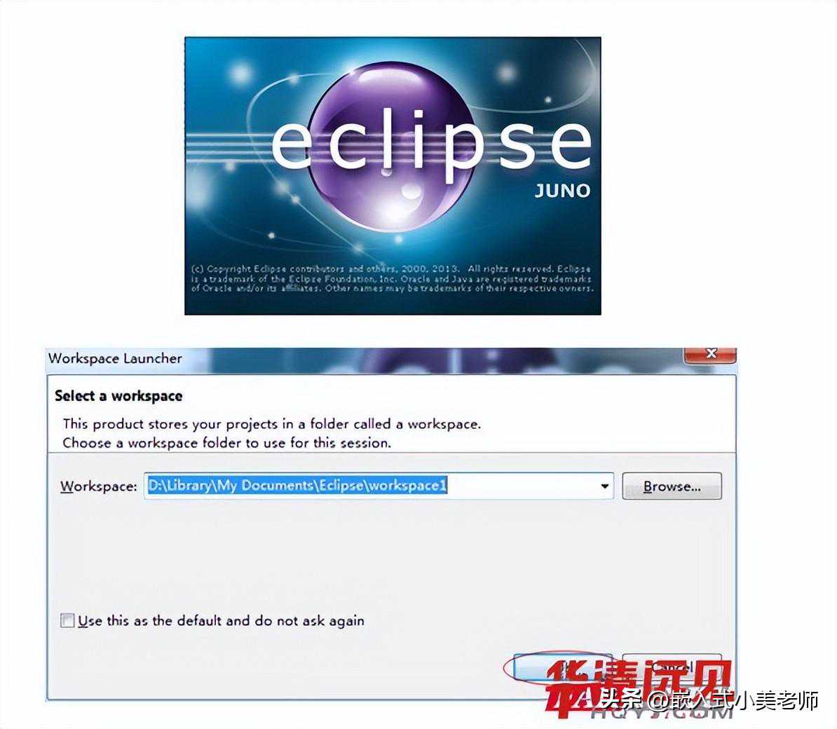 运行解压目录下的eclipse\,为自己选择一个工作目录Workspace,不要有中文路径,不选择默认也可以。