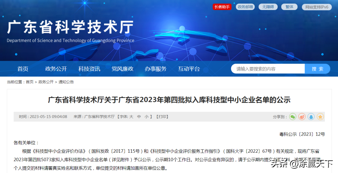 涂赢天下讯:2023年5月15日,广东省科学技术厅根据《科技型中小企业评价办法》(国科发政〔2017〕115号)和《科技型中小企业评价服务工作指引》(国科火字〔2022〕67号)有关规定,将2023年广东省第四批5073家拟入库科技型中小企业名单予以公示。
