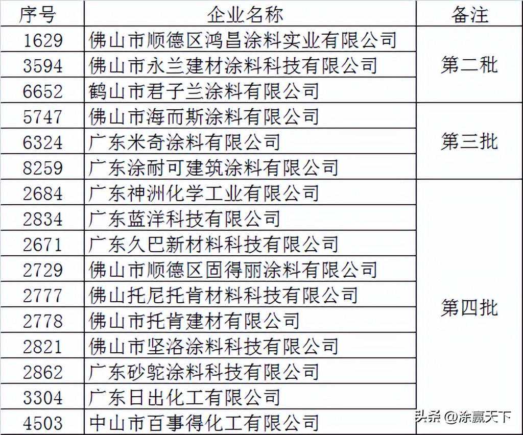 其中,广东米奇涂料有限公司、佛山市顺德区鸿昌涂料实业有限公司、广东砂鸵涂料科技有限公司、广东神洲化学工业有限公司、中山市阿里大师新材料有限公司、佛山市托肯建材有限公司、佛山托尼托肯材料科技有限公司、广东久巴新材料科技有限公司、佛山市永兰建材涂料科技有限公司、中华制漆(新丰)有限公司、广东蓝洋科技有限公司、鹤山市君子兰涂料有限公司、肇庆千江、佛山市海而斯涂料有限公司、广东涂耐可建筑涂料有限公司、佛山市坚洛涂料科技有限公司、佛山市顺德区固得丽涂料有限公司、广东日出化工有限公司、中山市百事得化工有限公司等多家涂料企业、原材料企业获评2023年广东省第二批、第三批、第四批入库科技型中小企业。