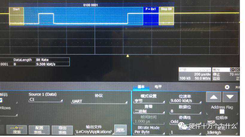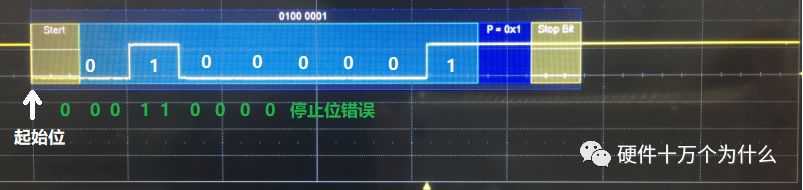 发送方发出9600波特率信号,但是接收方的波特率设置为19200。起始位没有问题,因为能够接收到那个下降沿,低电平。所以,会去解析数据,但是会出现误码。我们在信号上分析一下就知道了: