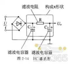RC滤波网络是一种特殊的分压器。如图2-14所示整流滤波电路中,R与C2可了解为分压器,输出电压Uo取自C2上的压降。