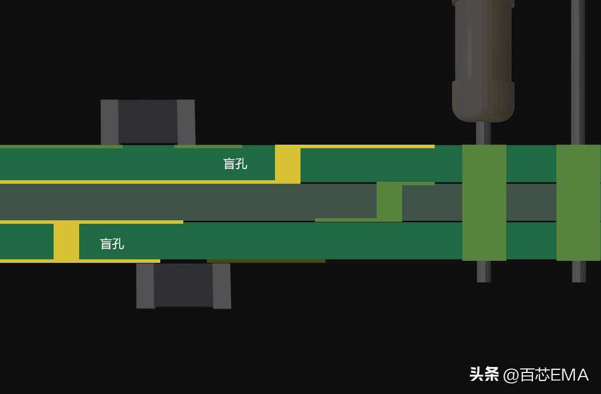 也可以使用盲孔,但大多数PCB板中的通孔都限制使用用于电源和接地网络布线的宽通孔。