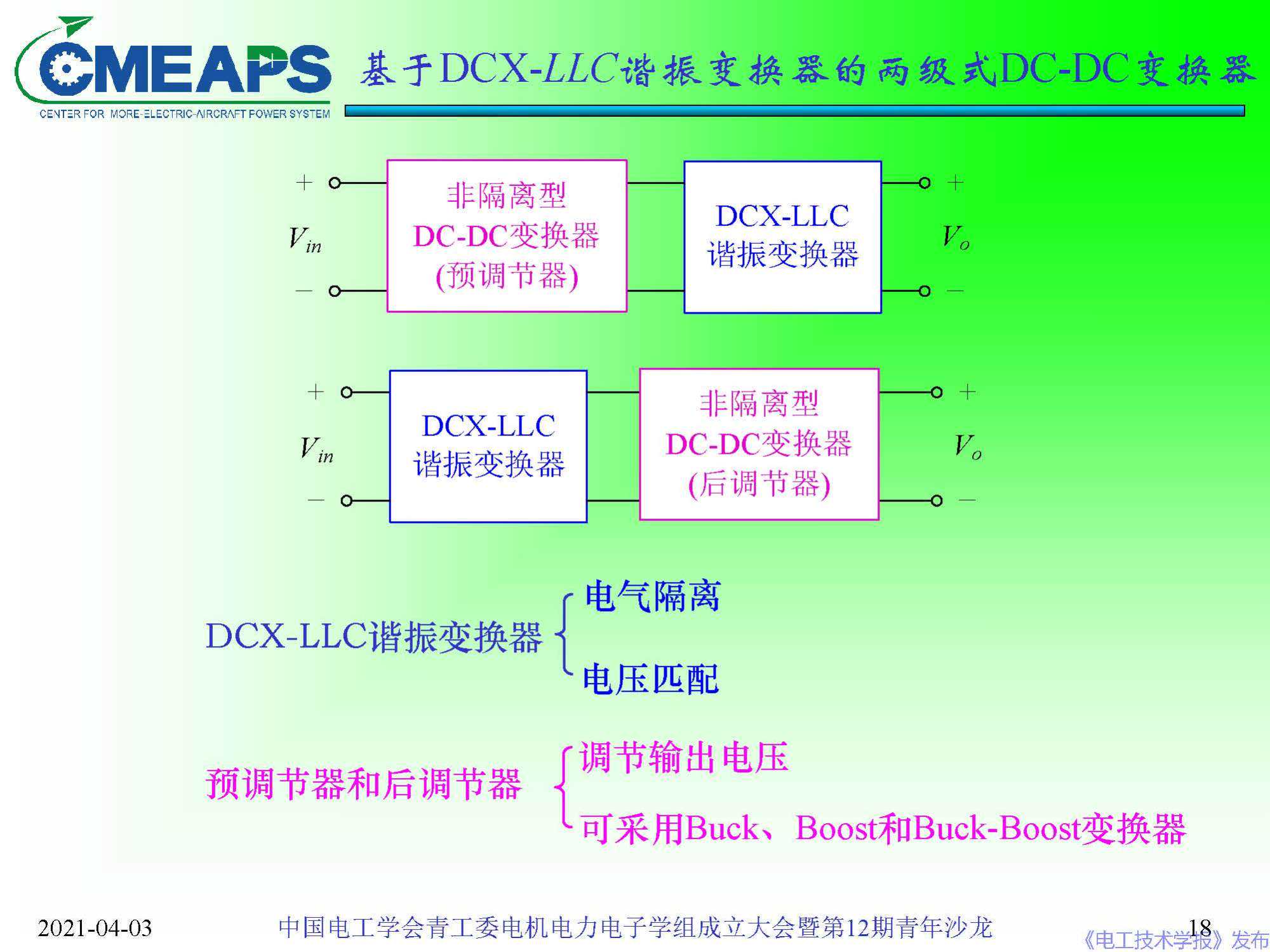 LLC谐振变换器工作在DCX模式,可以充分发挥其优势,实现高的变换效率。非隔离型DC-DC变换器与DCX-LLC谐振变换器结合使用,是一种合理有效的方式,非隔离型DC-DC变换器的零电压开关实现还需要进一步研究。